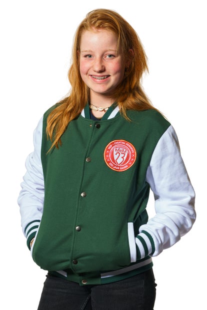 Emma is 1.45 m en draagt hier maat 140 hoodie en joggingbroek.